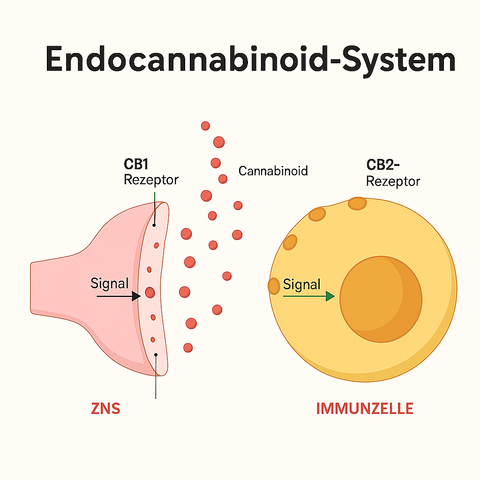 Das ECS funktioniert nach dem Schlüssel-Schloss-Prinzip: Der Körper produziert sogenannte Endocannabinoide („Endo“ = innen), die an spezifische Rezeptoren (CB1 & CB2) andocken – diese befinden sich im Gehirn, Immunsystem, Magen-Darm-Trakt und sogar in der Haut.